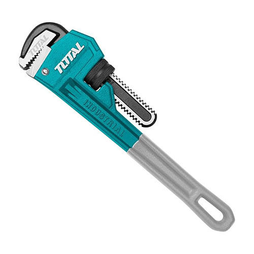 A pipe wrench is a heavy-duty tool designed for gripping and turning pipes and round fittings. It features adjustable serrated jaws that provide a strong, non-slip grip, especially on metal surfaces. Commonly used in plumbing, it is ideal for assembling or disassembling threaded pipe connections. Its robust construction ensures durability and effectiveness in tough working conditions.
